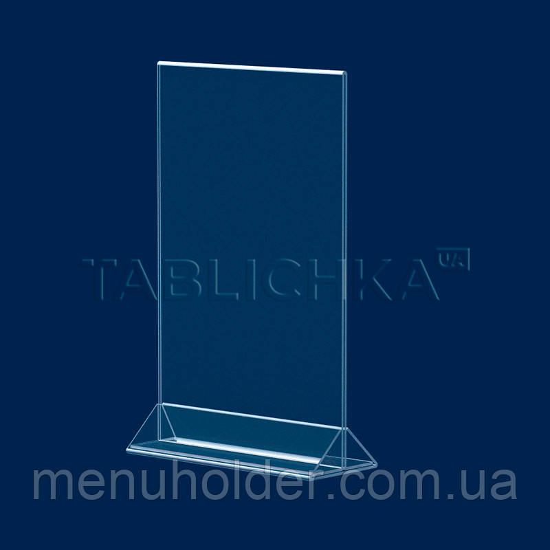Призначений для розміщення поліграфічної продукції формату А5 (148 мм х 210 мм). Матеріал: прозорий акрил 1,8 мм (основа) і ПЕТ 0,7 мм (верхня частина).